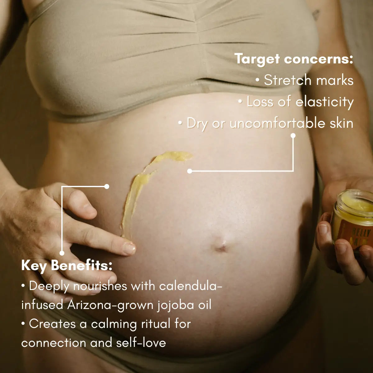 -BELLY BUTTER is full anti-oxidant rich oils and butters that bring moisturizing nutrients to tight, itchy skin, reducing chances of unsightly stretch marks.