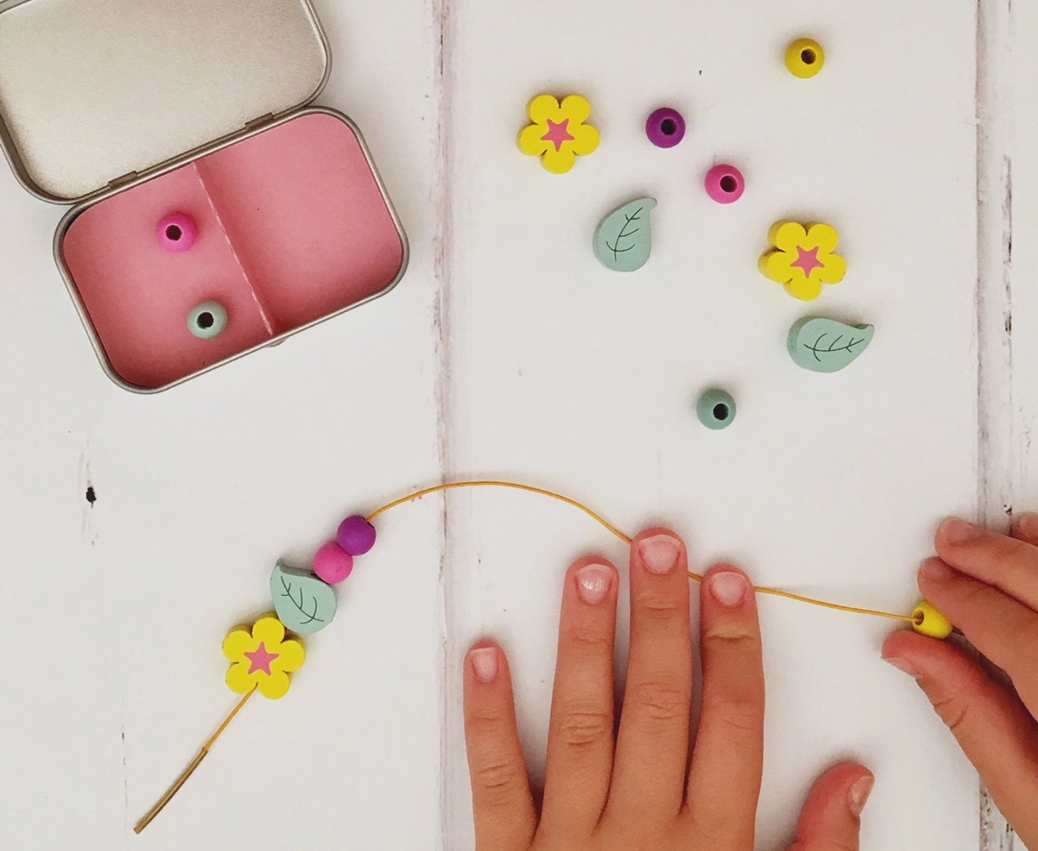 MATERIALS: Hinged tin, wooden daisy beads, wooden leaf beads, spherical beads, elastic with metal ends