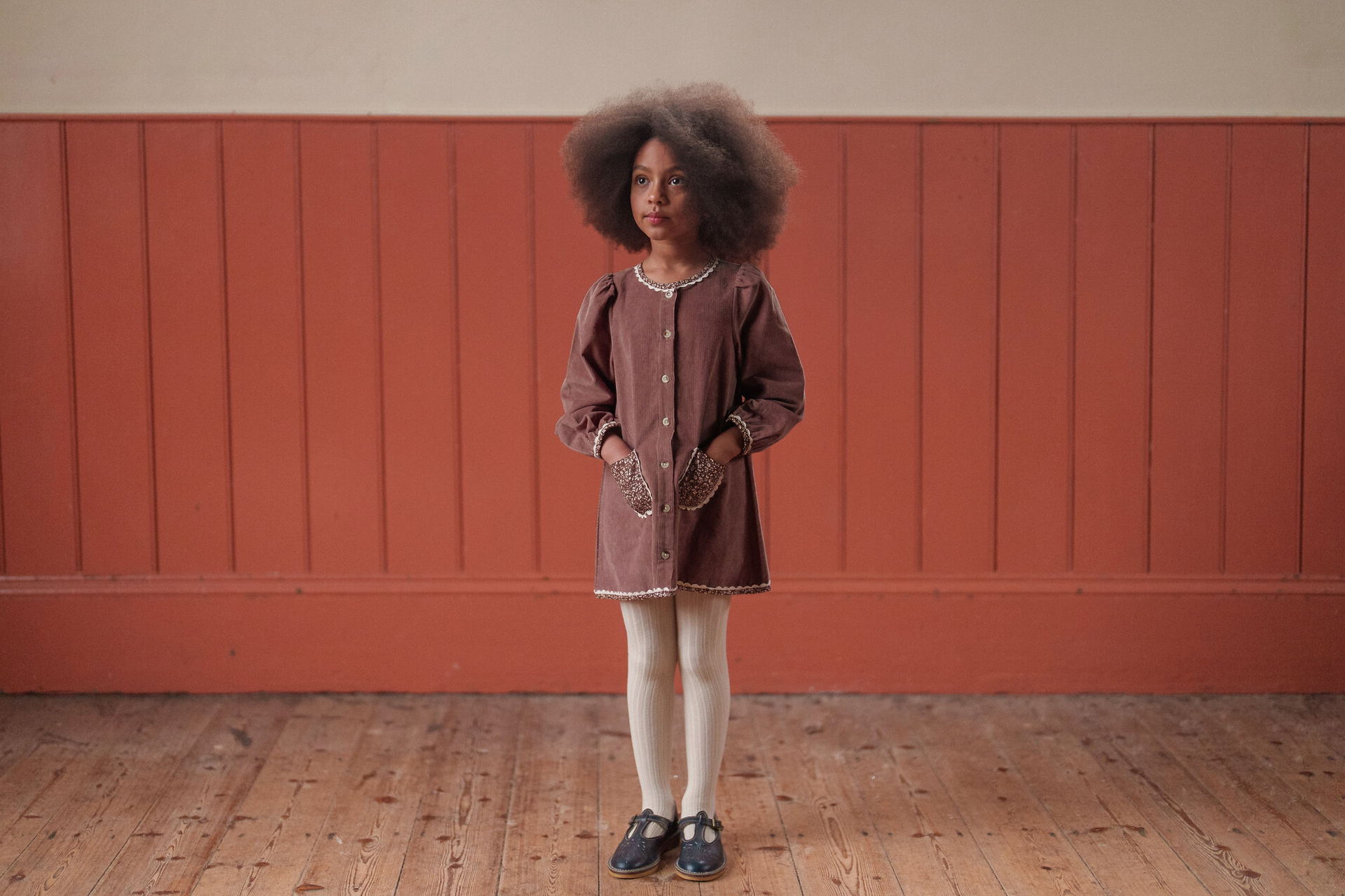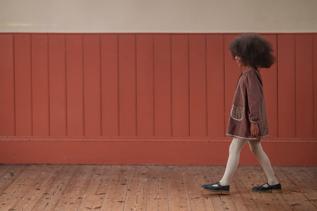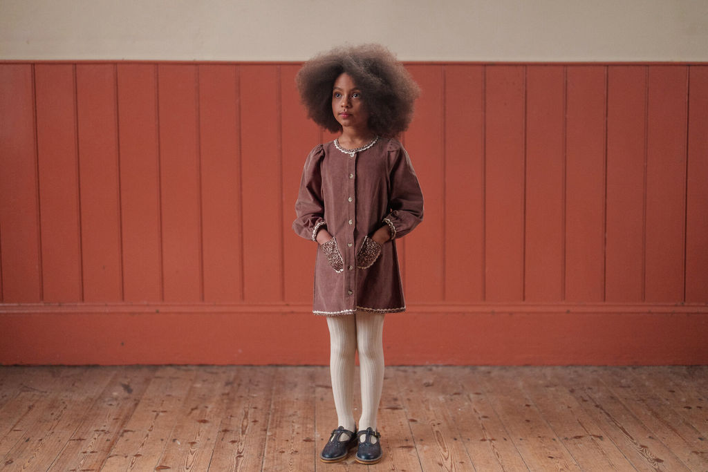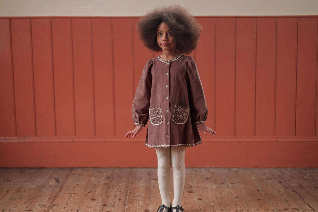 Add a touch of timeless charm to your little one’s wardrobe with this beautifully made A-line dress. Made in our organic cotton velvet in nutmeg, with contrasting floral binding trims. This dress offers both style and comfort, making it perfect for everyday wear or special occasions. This dress is easy to mix and match with our cardigans, jumpers, tank tops, tights and socks. The organic cotton fabric is gentle on delicate skin and durable enough to withstand the hustle and bustle of playtime.