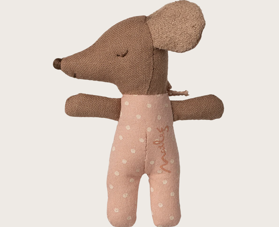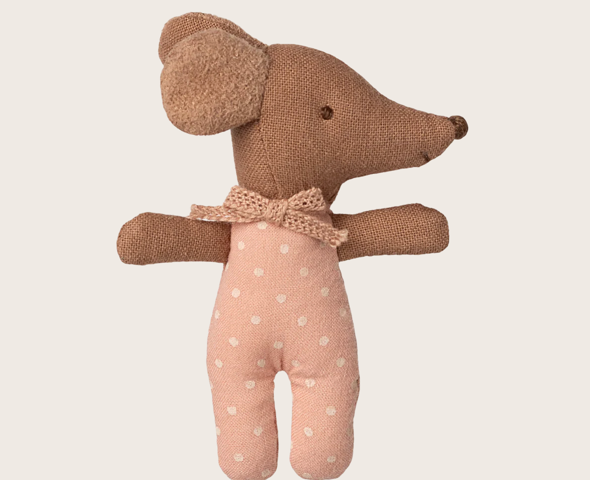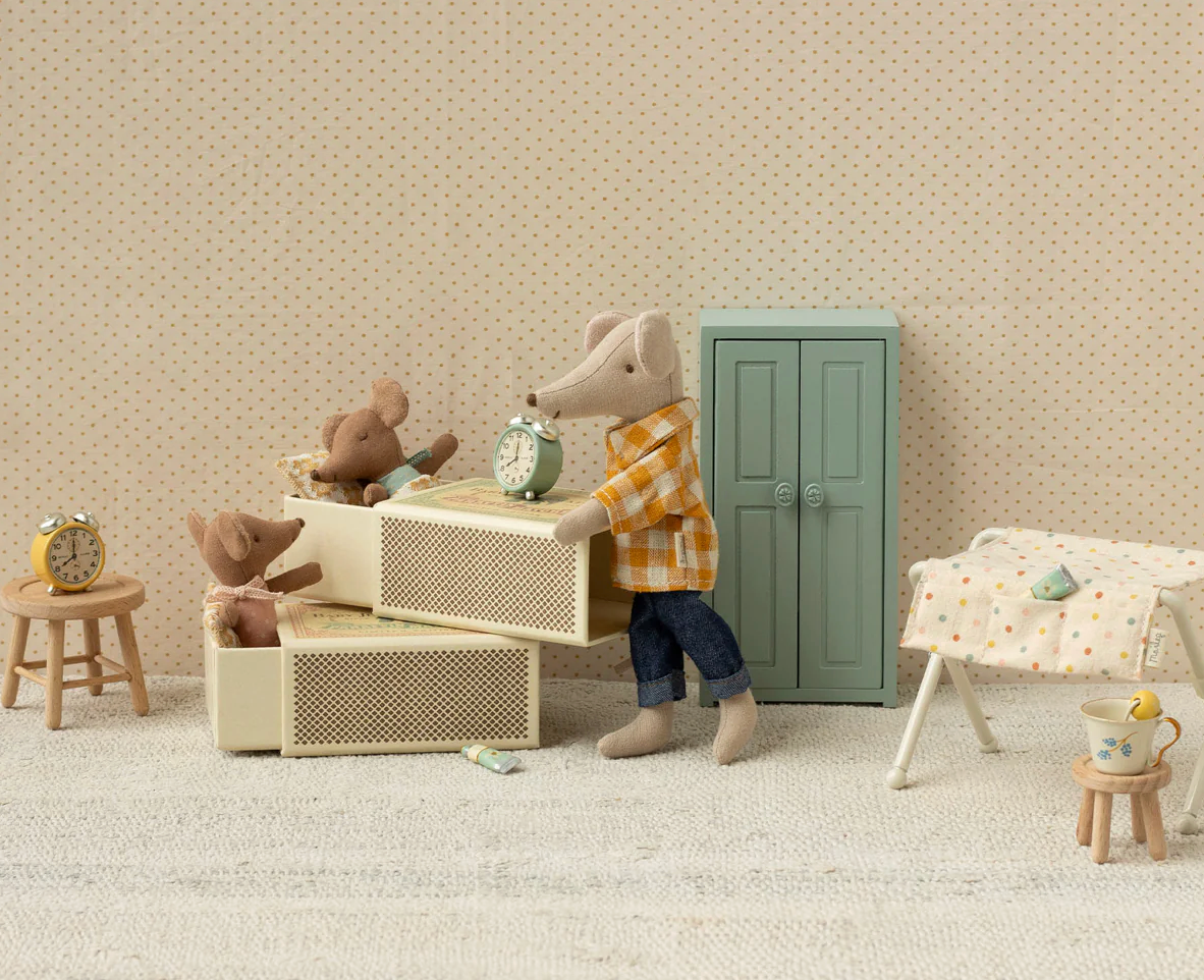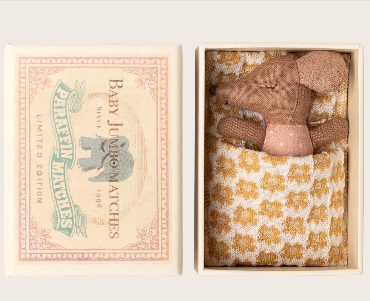 A classic Maileg item. This mouse is ready for hours of play and sleeps tight in the little matchbox. The clothes and bedlinen are made of soft fabrics with unique prints in beautiful colors.