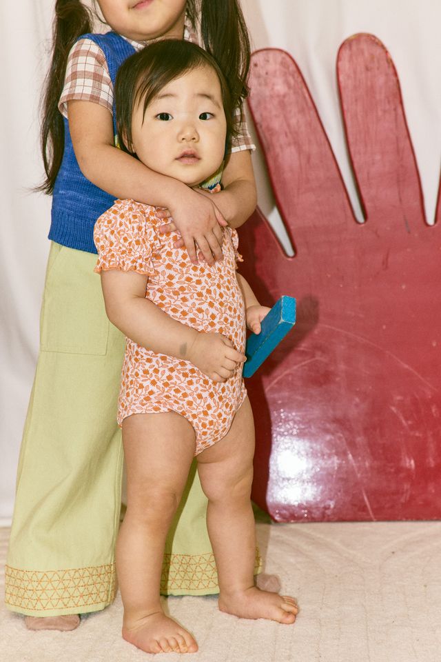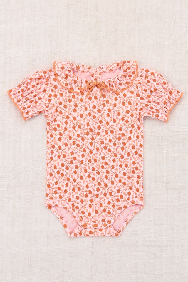 A long-sleeved onesie in organic Pima cotton, featuring a ruffle collar with a contrast merrowed edge and mini bow. Finished with snap closure at the bottom and back neck — perfect on its own or layered for a versatile, buildable look.