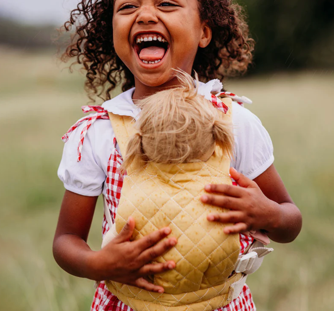 For the little one who takes their Dinkum everywhere. Whether it’s a trip to the garden, a grocery run with Mum, or a very important adventure to the lounge room, this golden carrier keeps Dinkum dolls tucked in close. With squishy straps and a padded pouch, it’s comfy, secure, and full of possibility. Just clip in and go – hearts don’t carry themselves, after all.