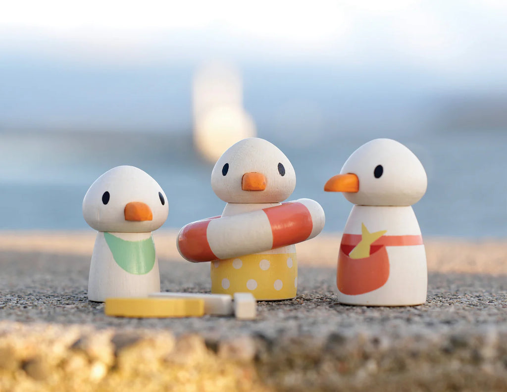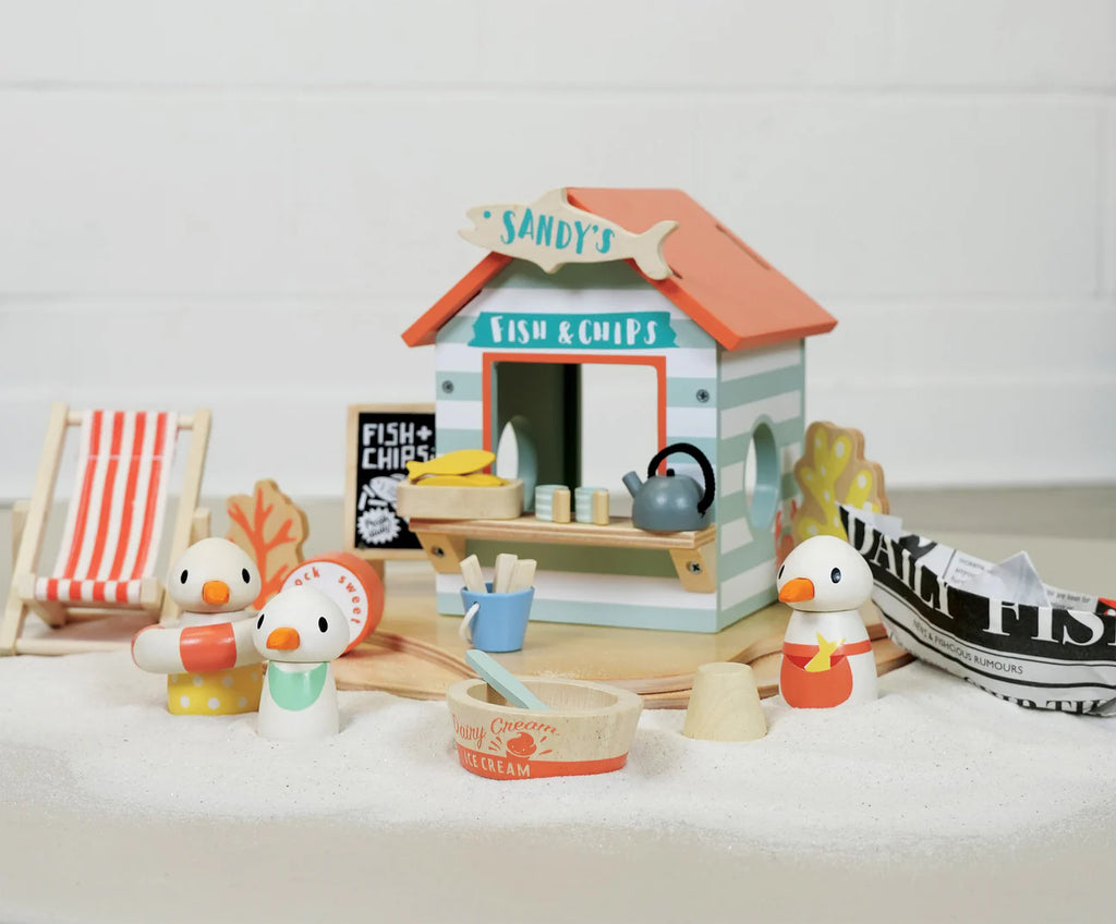 Meet Sandy the wooden toy seagull and her family down on the beach where they have inhabited a small beach hut and turned it into a fish and chips stall. Set on 2 bases of plywood that resemble sand, they have collected two pieces of seaweed, a deck chair, a kettle, a wooden tub of ice cream and spoon, three fish in a dish, a bucket with chips, a fish and chips sign, a sand castle, a piece of candy rock, and a boat made from newspaper. Check out Gully the dad seagull who has a knitted hat and a removable wooden ‘rubber’ ring. Names of the seagulls are written underneath so that these little characters can become part of a story-telling seaside adventure. Perfect for creative story-telling and imaginative play.