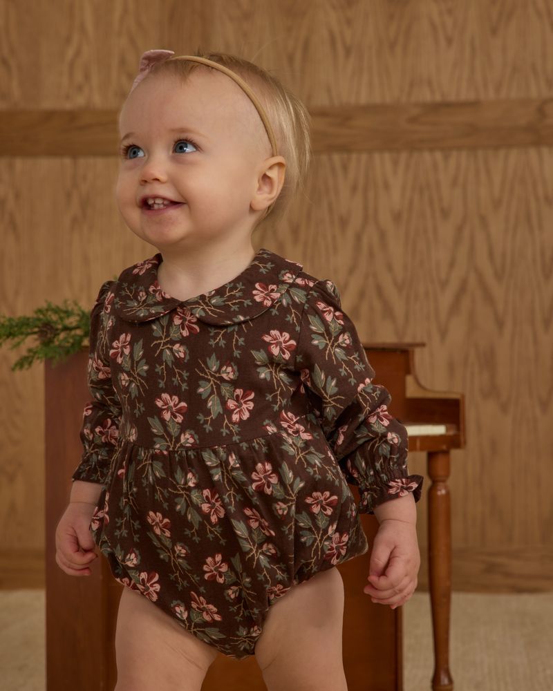 Sweet baby one-piece with a charming Peter Pan collar and long sleeves. Features bottom snaps and a back closure with four coconut buttons for easy changing.