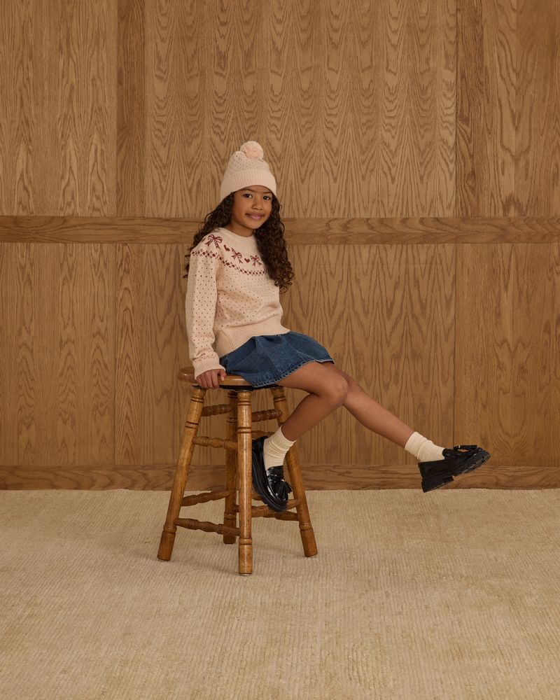 This Fair Isle Sweater is a cozy knit featuring a sweet bow motif and traditional fair isle patterning. Designed in a soft petal base with warm accents, it brings both comfort and charm to everyday wear.