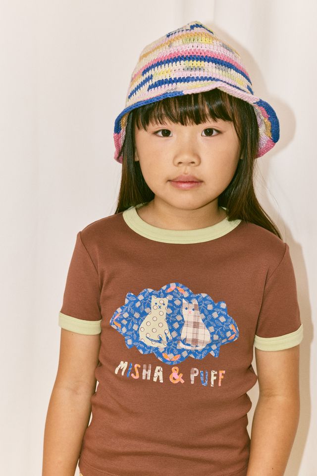 A slim-fit graphic ringer tee in soft organic Pima cotton, featuring a custom collage design and prints from the season, with contrast neckline and sleeve trim.