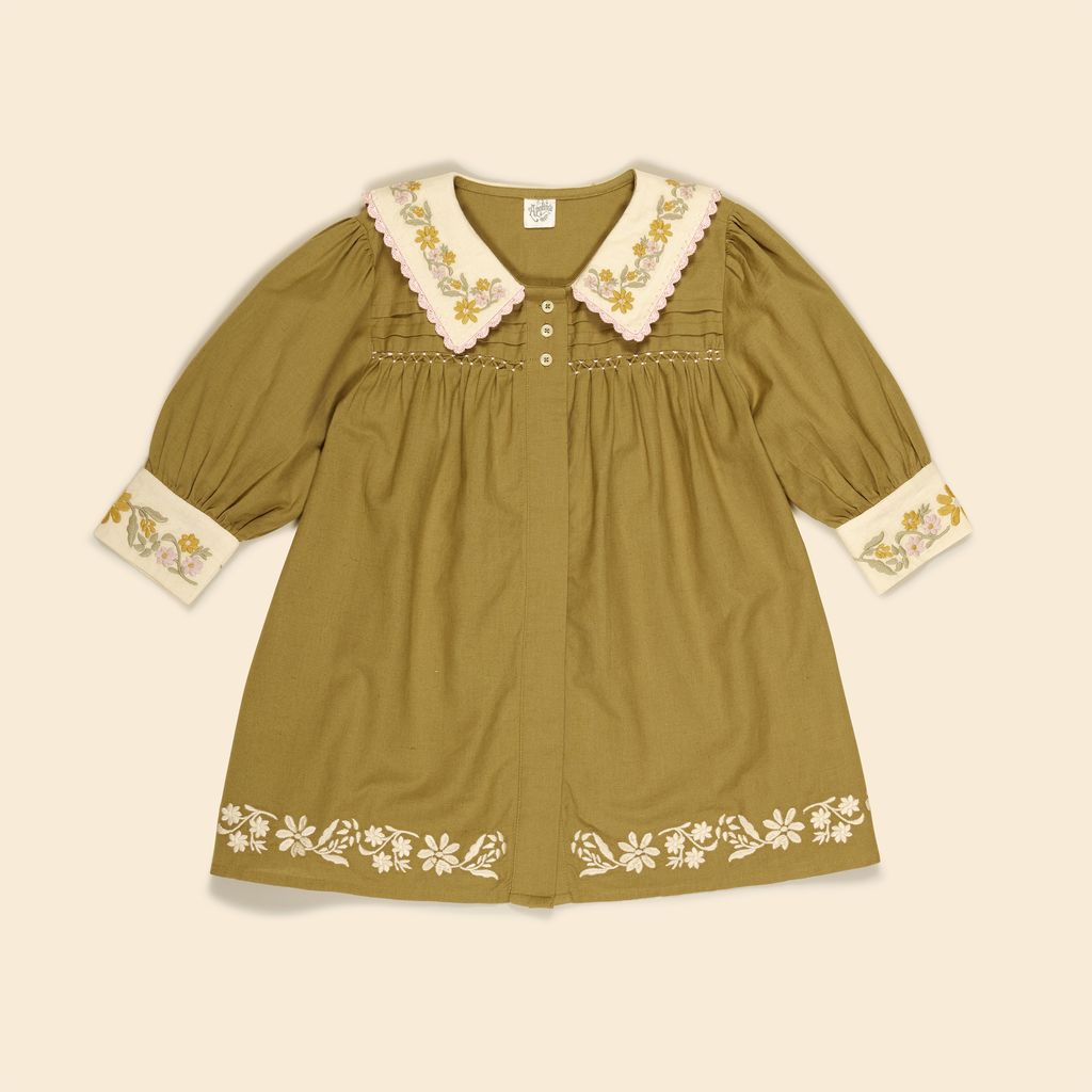Based on our much loved Bette blouse, the beautiful Bette dress is crafted from our rustic cotton-linen in ‘dried moss’, with embroidered contrast cuffs and a retro sailor style collar embroidered at front and back. Featuring pinch smocking at chest, contrast ivory embroidery at hemline and sweet handwork trims. We love Bette layered over our leggings or dressed up with tights and shoes.