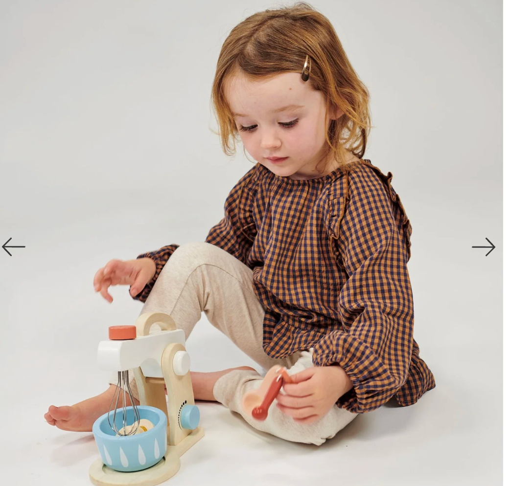 This wooden cake mixing toy comes with a blue bowl, a metal whisk that turns with a top button. There is a clacking button to select speed, and the arm with the whisk can be lifted to remove the bowl. Also included is a 2-part egg, and 3 measuring spoons.