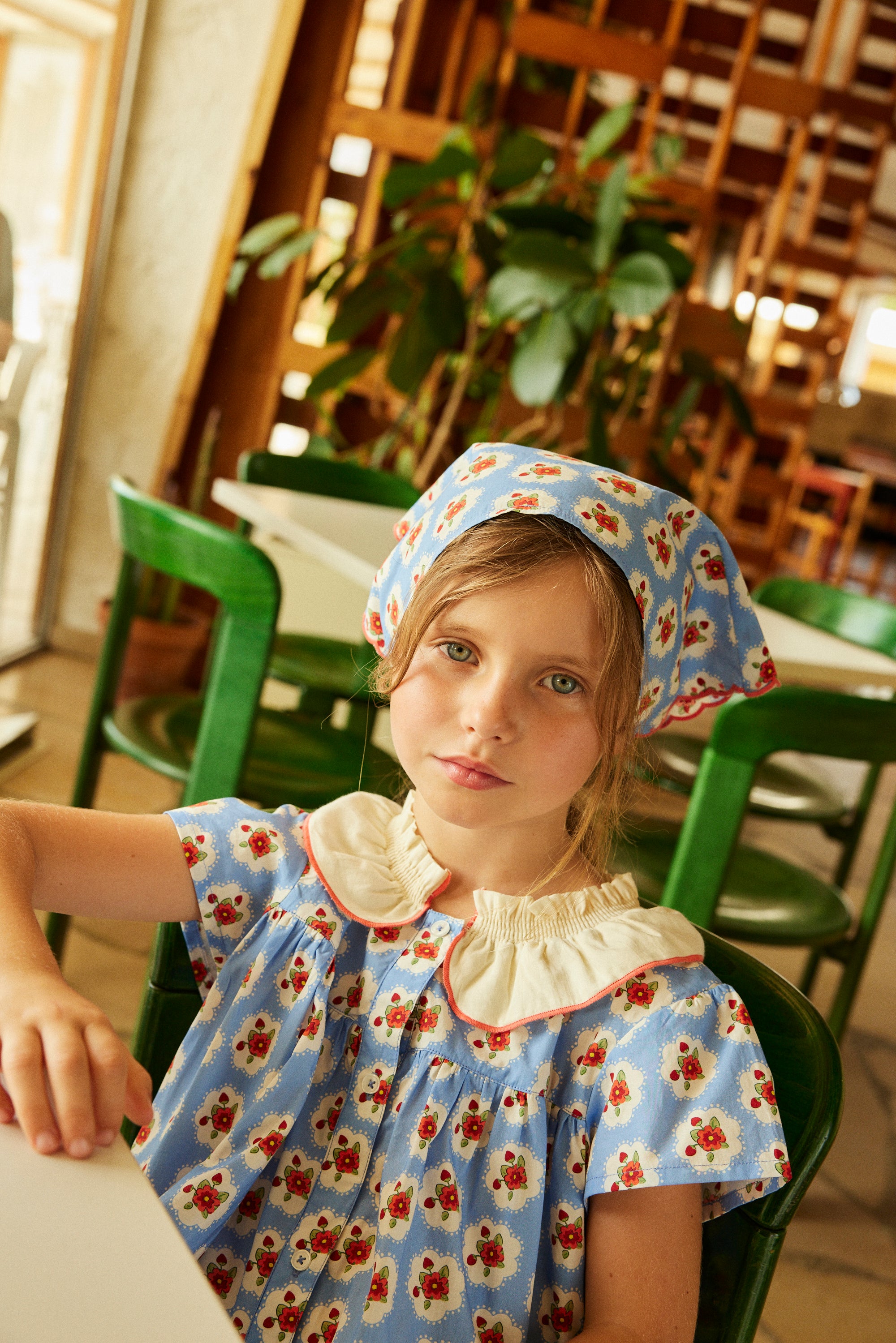 A short sleeves dress in printed cotton poplin, featuring a gathered yoke, rounded off white flounce collar. Tab button on front.