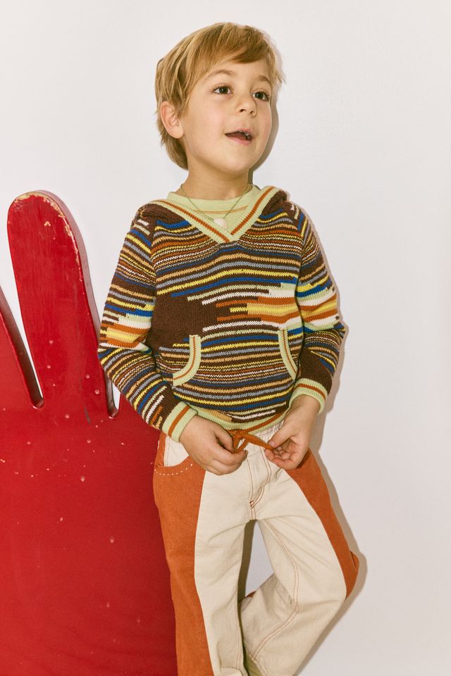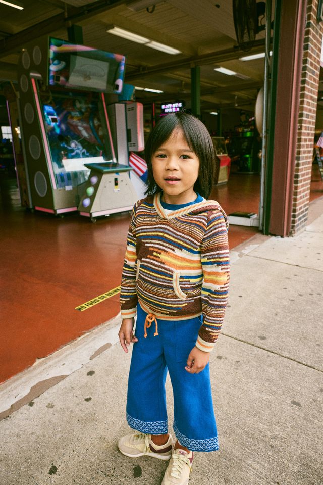 A pullover hoodie in a fine-gauge Pima and bouclé cotton blend knit, featuring a roomy body, front kangaroo pocket, sporty stripes on the ribbed trim, and a popcorn-tie drawstring closure at the bottom for an adjustable fit.