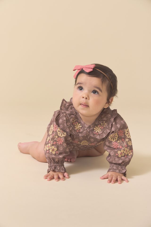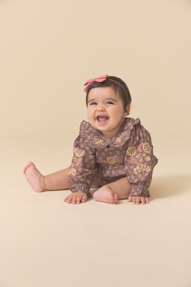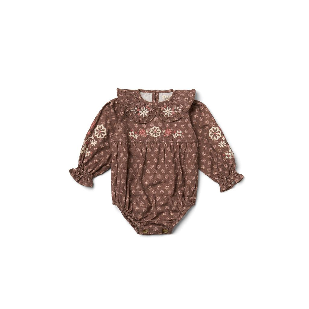 Little Belle Romper in Brown Block Print - 3m is backordered and will ship as soon as it is back in stock.