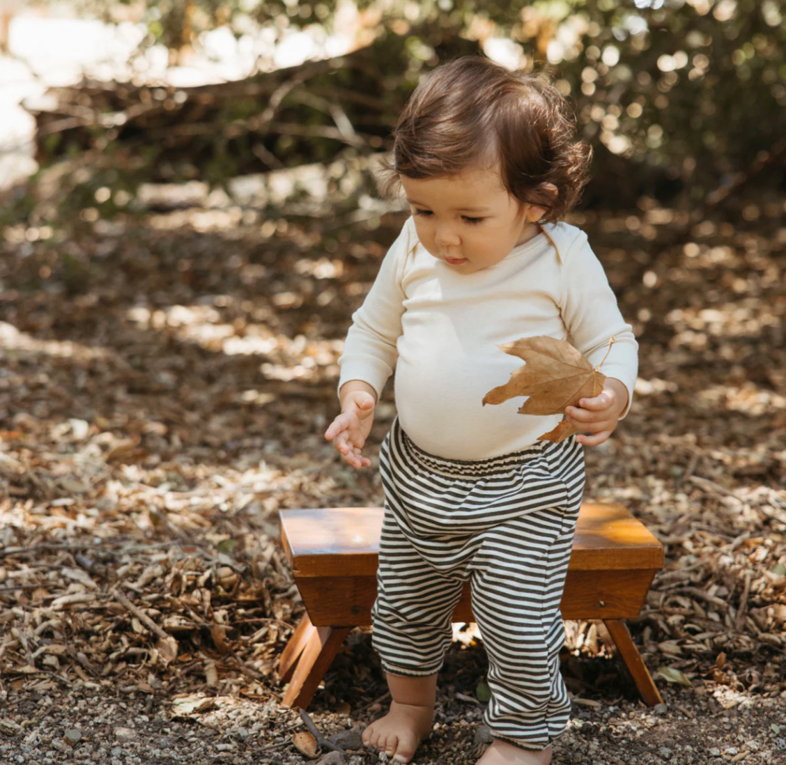 A soft rib onesie with rib binding through leg area and a lap tee neck opening. 3 snaps in between legs.  A long style onesie that hits a little below hip.