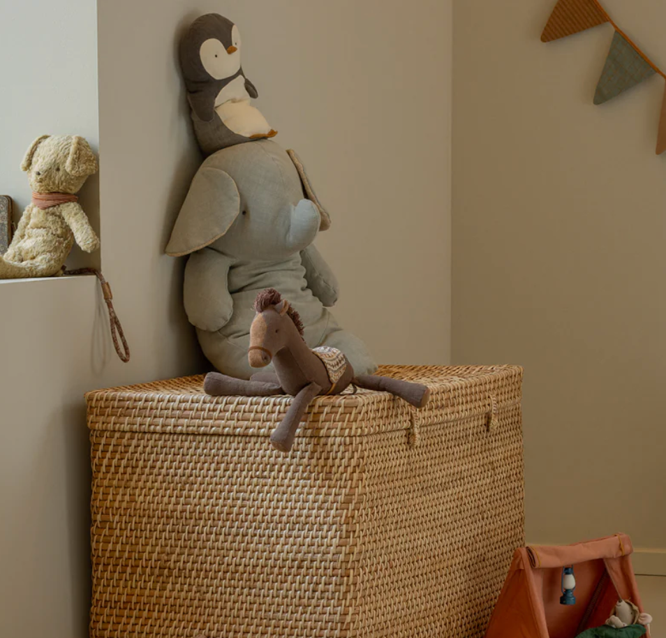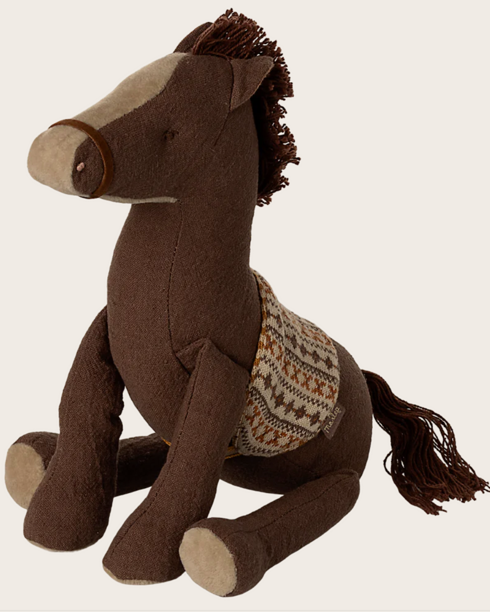 The brown pony is made in a soft cotton/linen fabric. The mane and tail is cotton strings and the saddle is made in soft knitted fabric that guarantees the ride will be comfortable.
