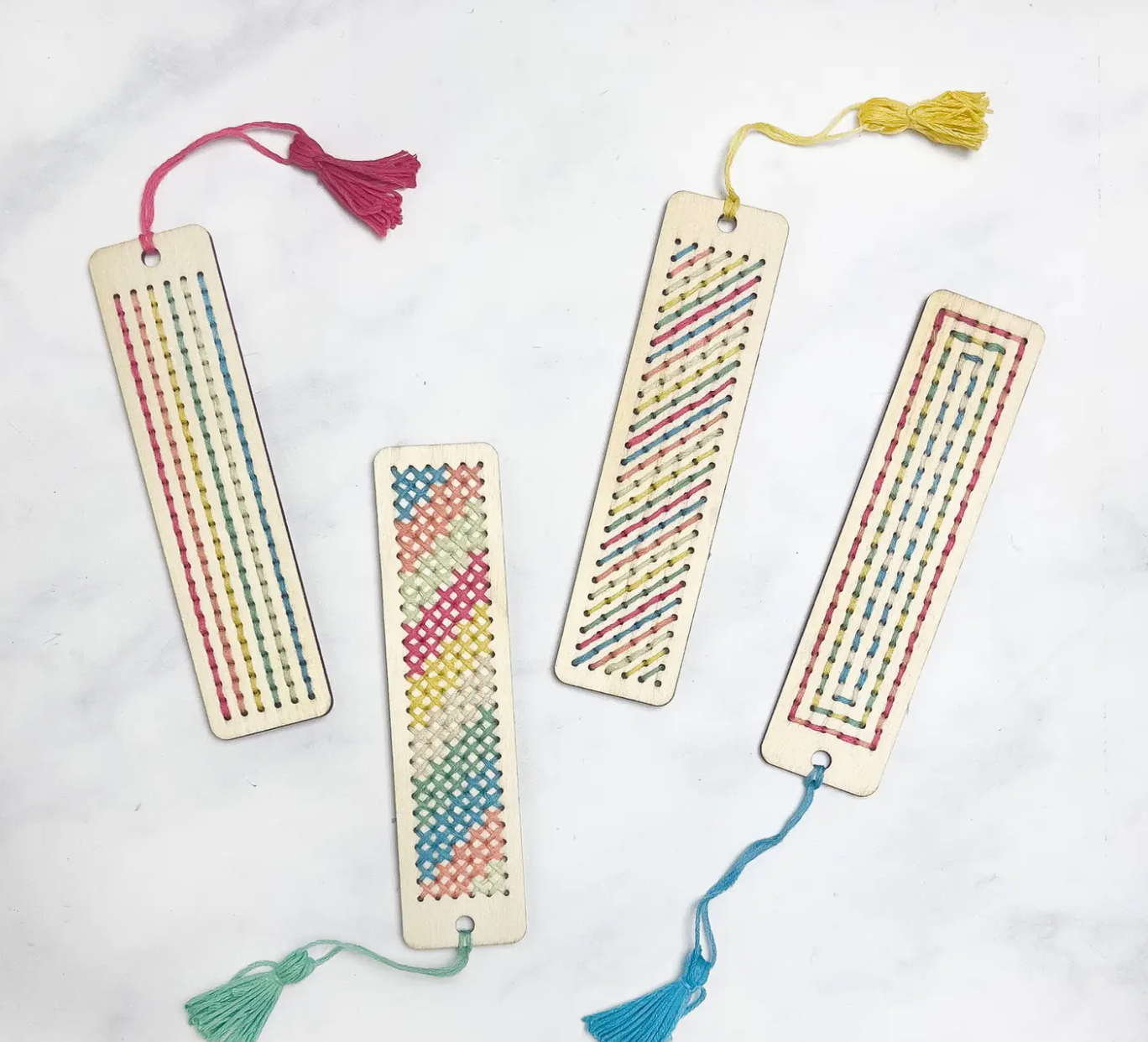 Introducing our Stitched Tassel Bookmark Kit, a delightful blend of creativity and functionality! Inside each kit you'll find a sturdy wooden bookmark ready to be stitched, a pack of pastel-coloured cotton threads and a durable metal embroidery needle