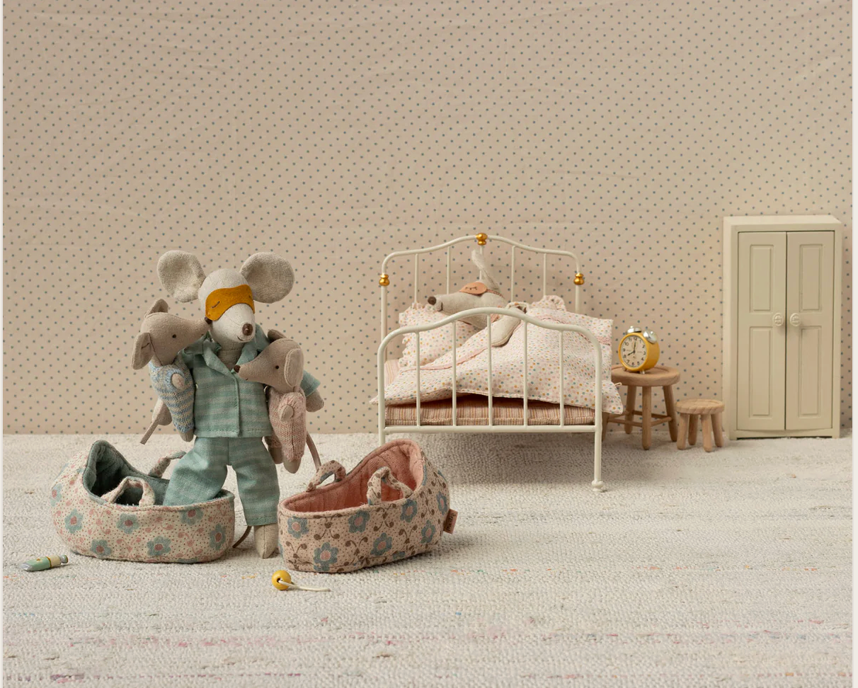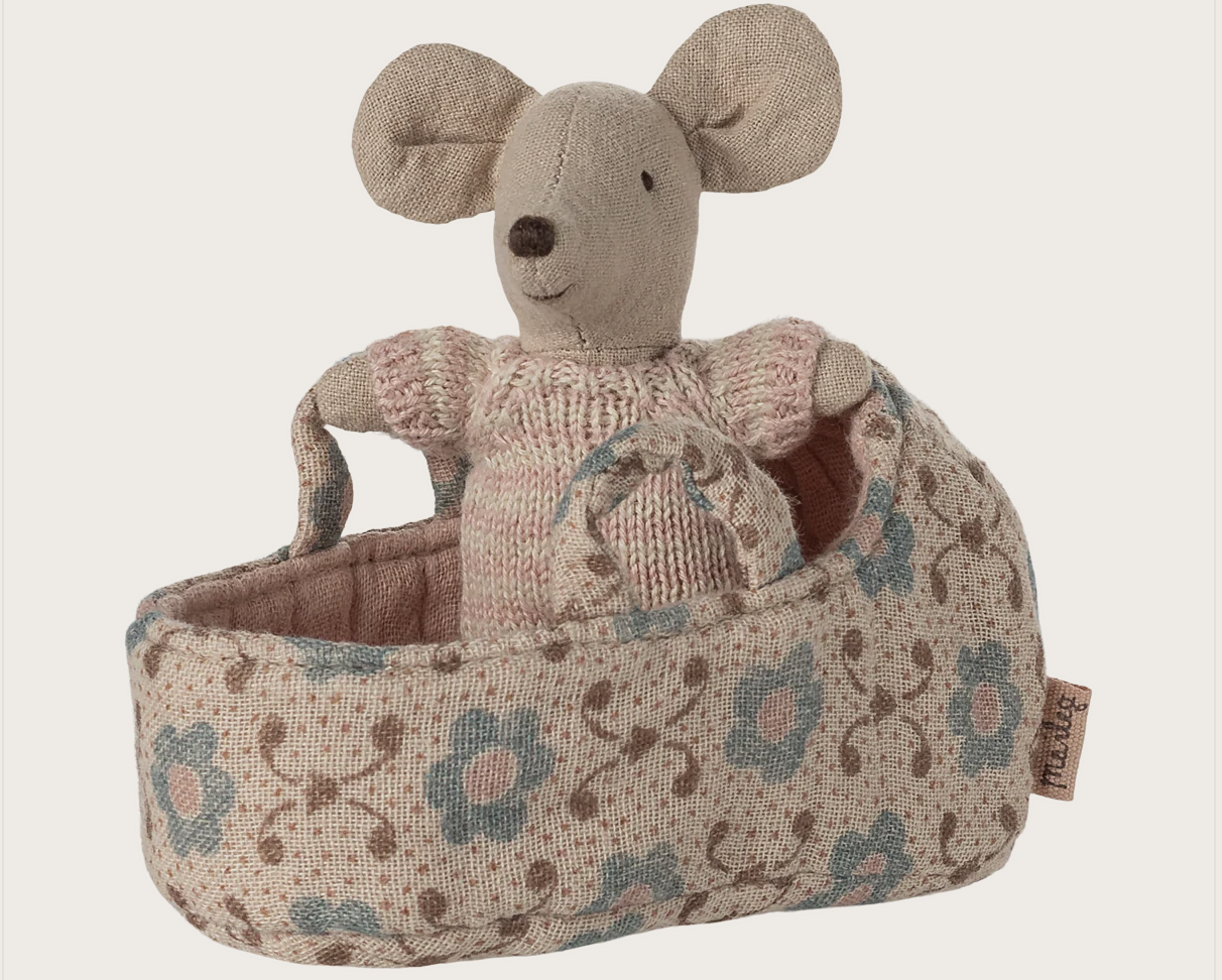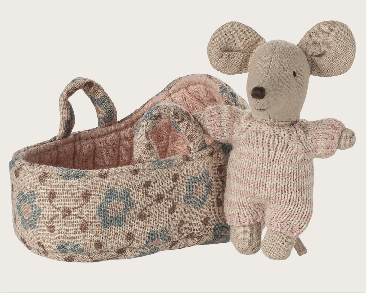 A small baby mouse in a soft and striped knitted suit. It sleeps for hours in its little quilted carry cot.
