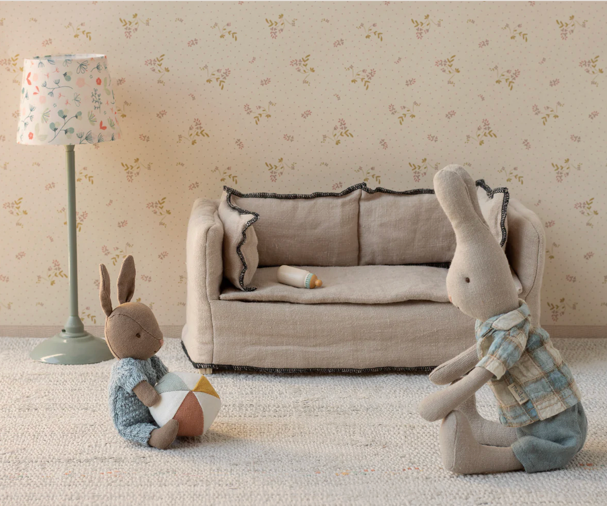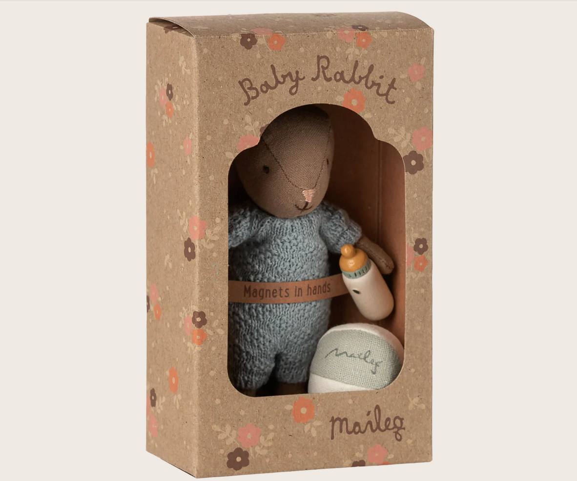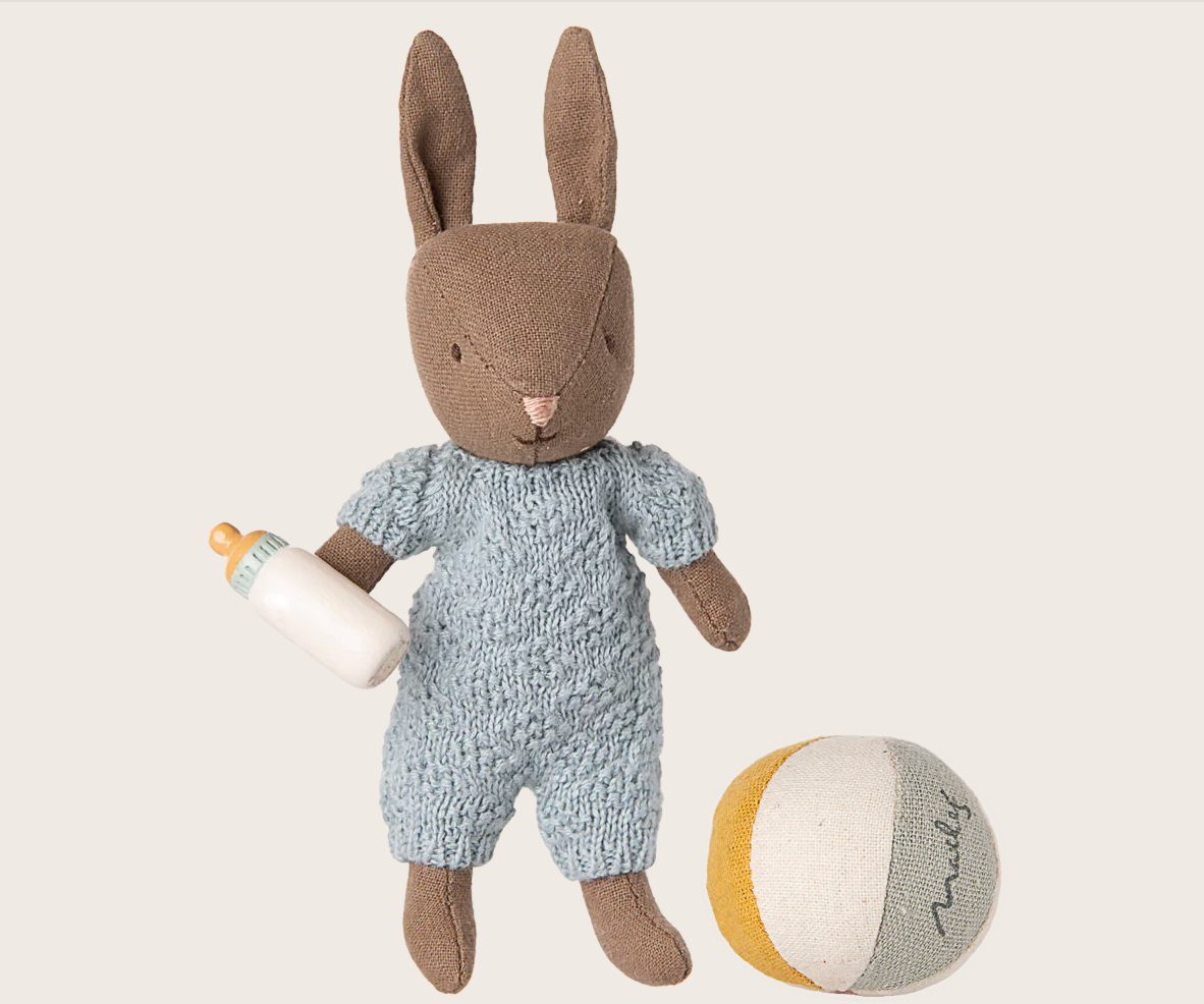 The perfect gift set to start hours of storytelling. It contains a small ball, a soft bunny in size micro with magnets in hands to hold the babybottle. All fitted nicely together and a great start of any bunny collection.