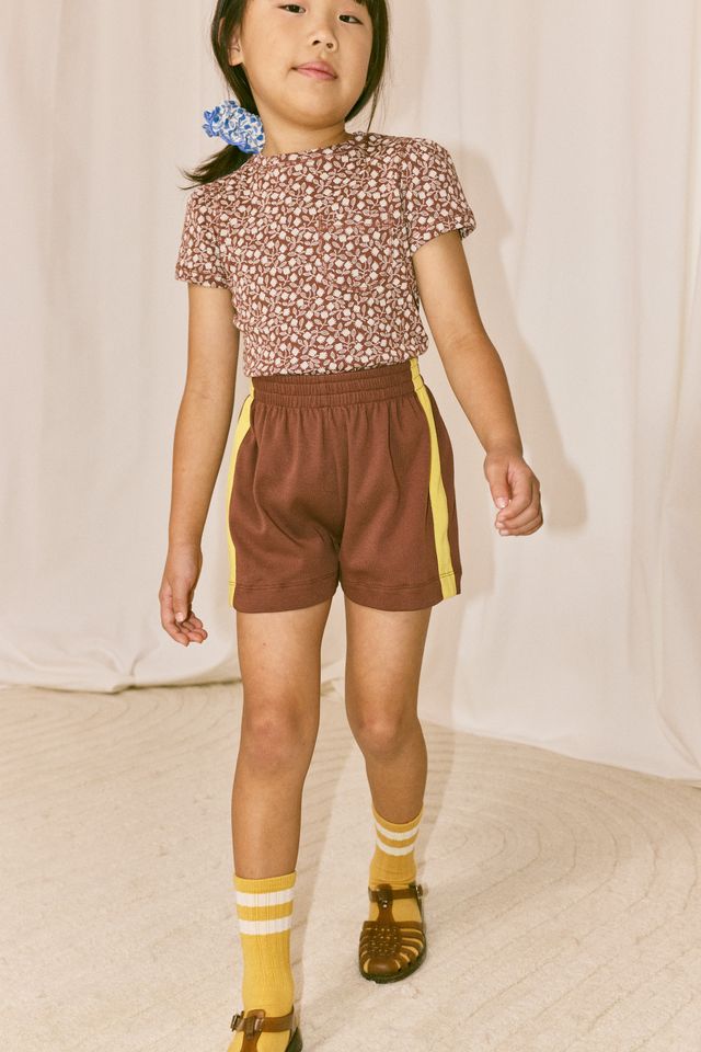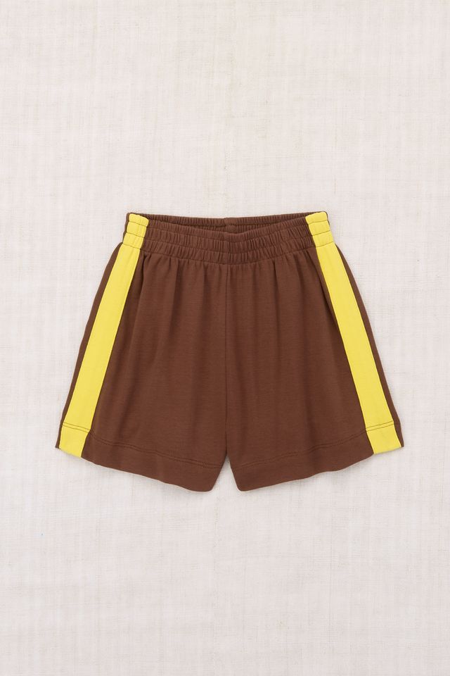 A vintage-style pull-on short in organic Pima cotton, with an elastic waistband and contrast appliqué striped sides.