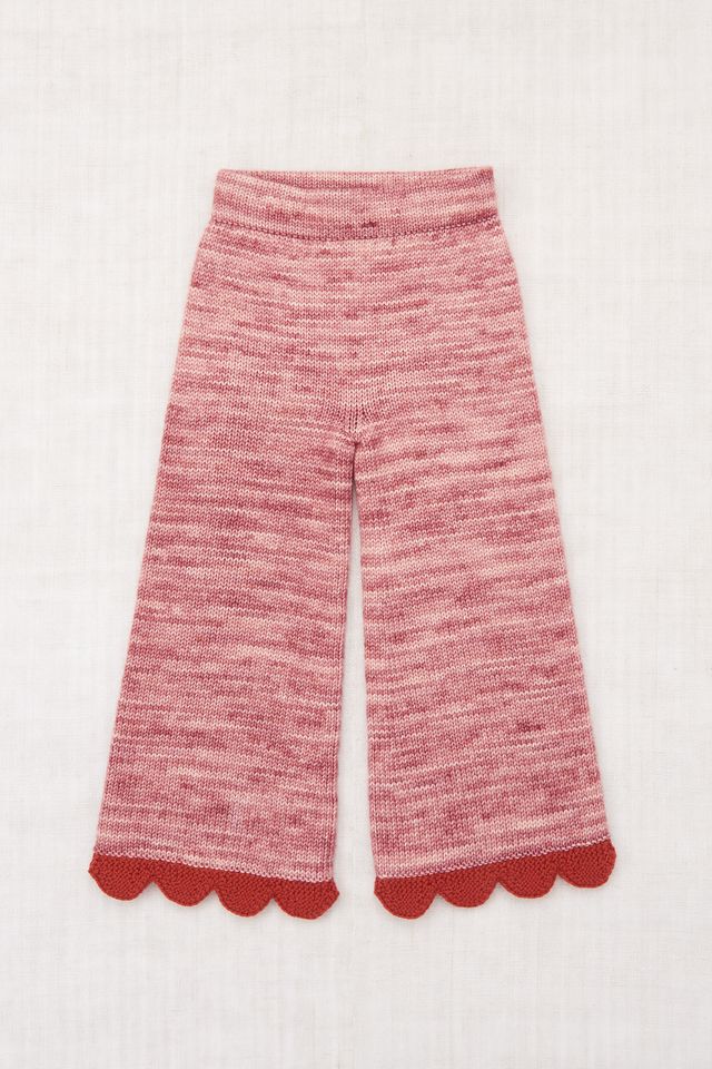 A fitted pull-on pant in a Merino wool knit, featuring a slight A-shaped flare, a soft banded elastic waistband, and a hand-knit scalloped hem.