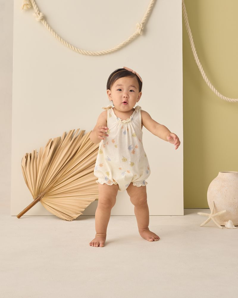 This soft bubble onesie features fixed tie shoulder straps and bottom snaps for easy changes.