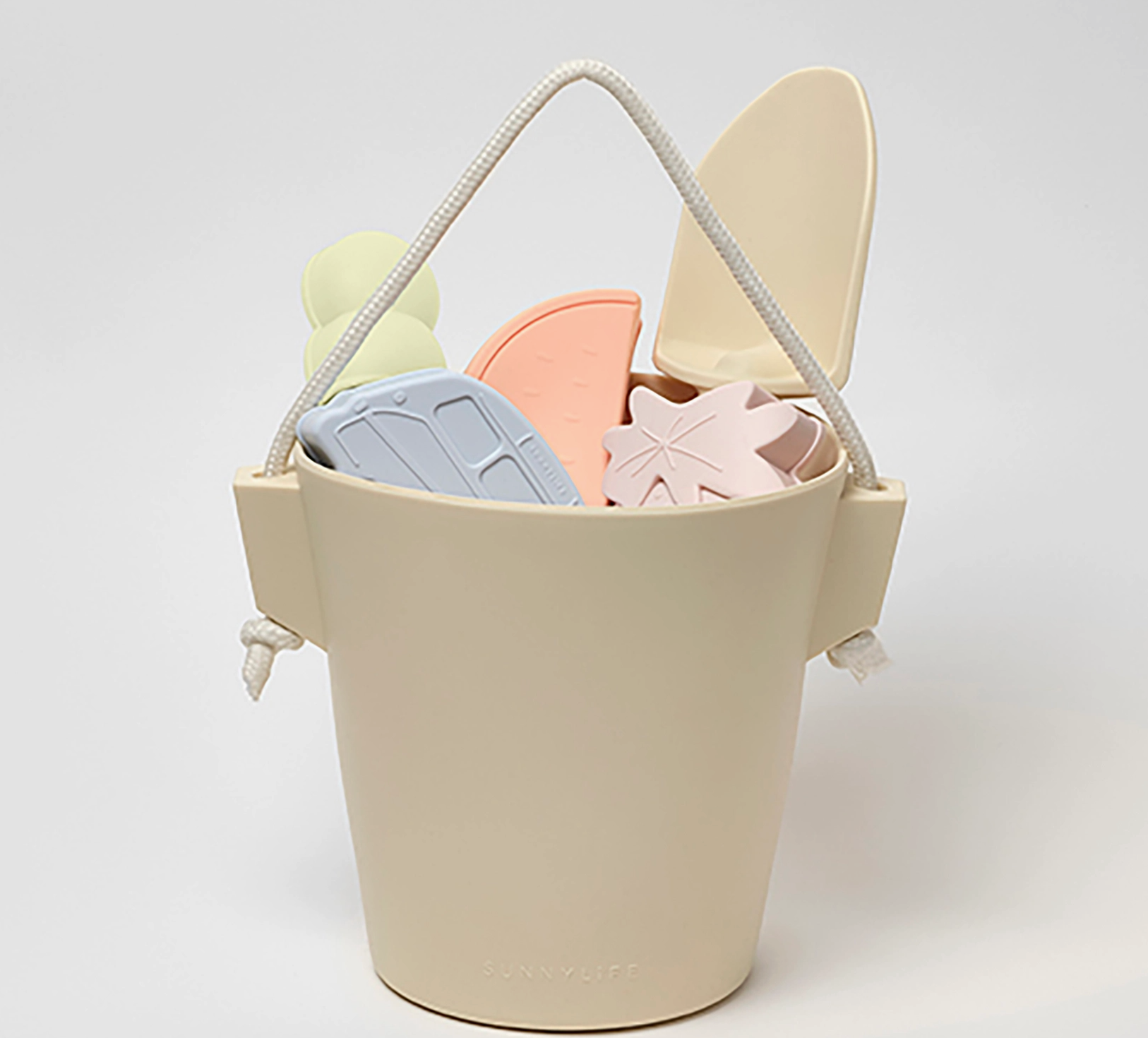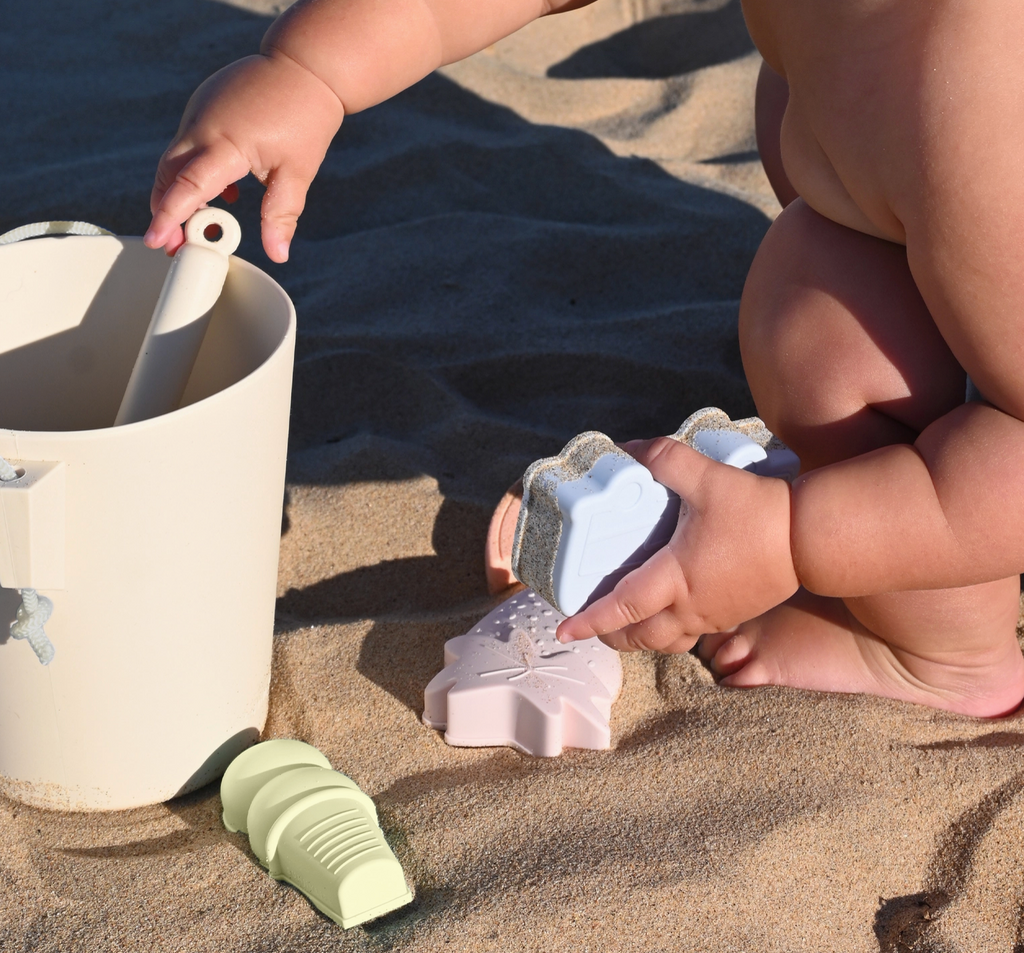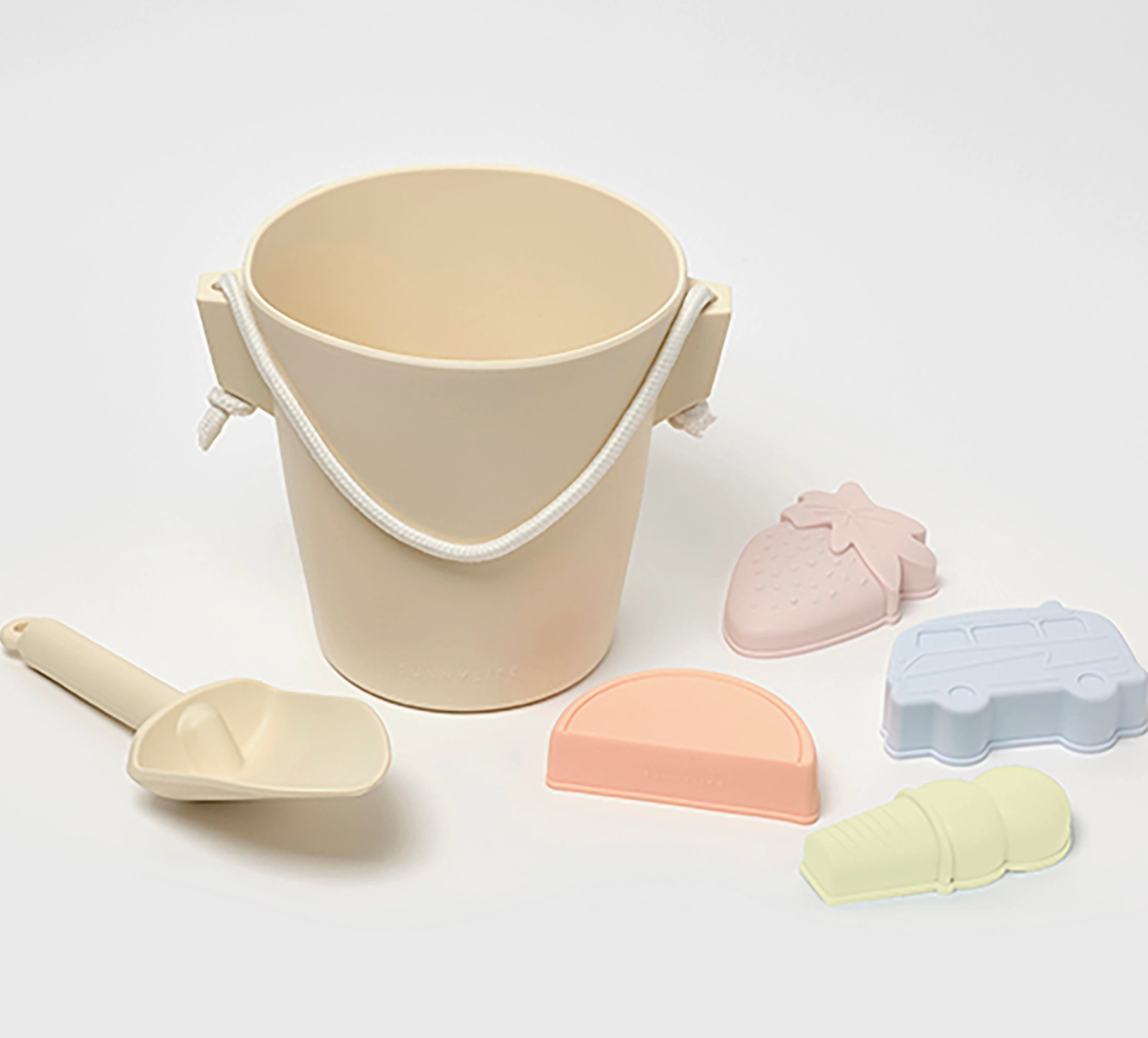 Includes 1 bucket, 1 spade, and 4 sand molds: campervan, watermelon, ice cream, and strawberry. Nylon rope handle. Dishwasher safe. Made from 100% food grade Silicone.