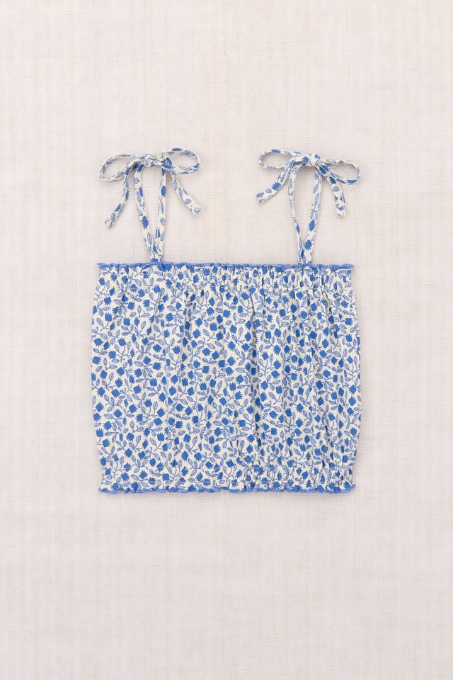 A sweet tank top in organic Pima cotton, with ruffle trim finished with a merrowed edge and adjustable tie straps.